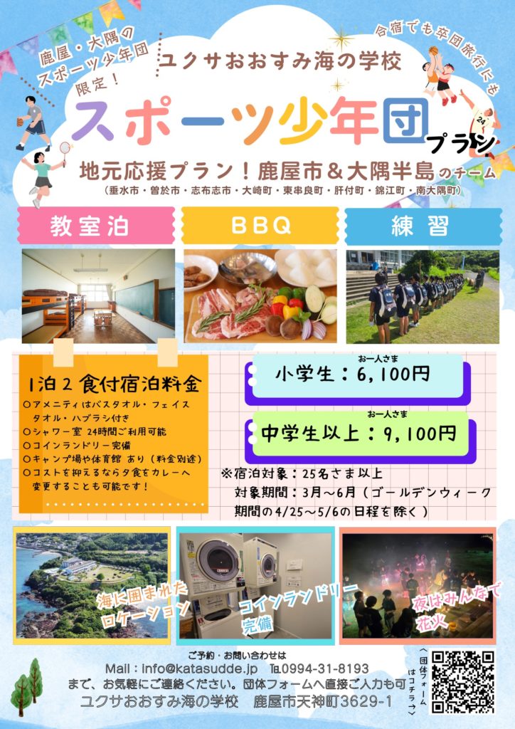 ◇鹿屋市内、大隅半島(4市5町、垂水市、曽於市、志布志市、大崎町、東串良町、肝付町、錦江町、南大隅町)のスポーツ少年団チームで25名以上でのご宿泊(6人/12人クラス)